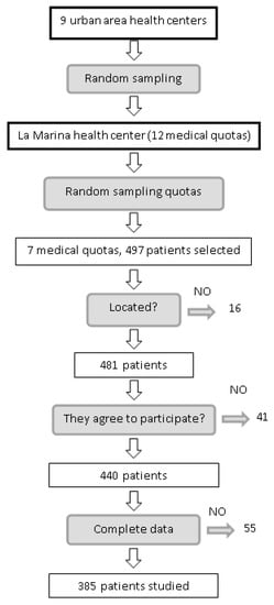 This was a case-control study based on a sample from an analysis of prevalence of DR in patients with type 2 diabetes mellitus [] performed between November 2013 and February 2015. The catchment area of the study was the urban area of Santander (northern Spain), which includes 10,744 patients known to have type 2 diabetes mellitus. The target population comprised patients from the study area diagnosed with type 2 diabetes mellitus according to their clinical history. Multistage cluster random sampling was performed. In the first stage, we selected one of the nine health centers from the metropolitan area (La Marina Health Center). In the second stage, we selected groups of patients from the center until the sample size was reached. Both stages were performed using simple random sampling, with probability proportional to the size of the population. Physicians updated the lists of patients with type 2 diabetes mellitus in order to avoid errors in diagnosis.