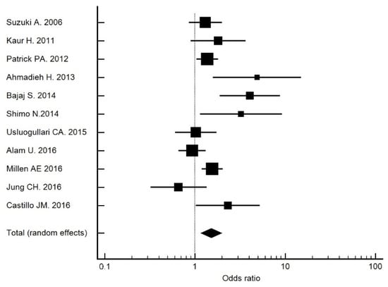 The crude OR for 25(OH)D deficiency (<20 ng/mL) was 2.31 (95% CI: 1.02, 5.22; p = 0.044), which was higher than that recorded in the meta-analysis of Luo et al. [] (OR 2.03) and Zhang et al. []. (OR 1.27). A similar result was obtained in a study performed in China (OR 1.93) []. In our meta-analysis [,,,,,,,,,], which included studies up to 2016 (Figure 2), those studies with a cutoff point of 20 ng/mL had an OR of 1.51 (95% CI: 1.16, 1.97). Therefore, 25(OH)D deficiency was associated with DR. The OR adjusted for risk factors remained at 2.47 (95% CI: 1.07, 5.52) in Model 1.