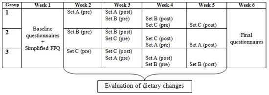 Summary of questionnaires and evaluations completed, by week and by group of participants, during the 6-week online longitudinal quantitative study. Each set of dietary changes was composed of six dietary changes (two by type). Evaluations were performed when the set was shown to the participant for the first time (pre) and then after one week of reflection about whether she might use each of the dietary changes of the set in her diet (post).