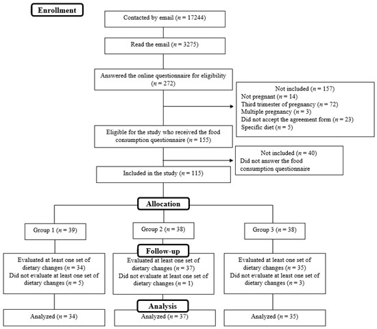 Seventeen thousand, two hundred and forty-four women aged between 18 and 44 years, living in mainland France, and members of an online panel operated by a generalist market research company (QualiQuanti, Paris, France) were contacted by email to ask if they were pregnant and were willing to participate in the study. To register, the women had to sign the consent form electronically and answer a questionnaire on their sociodemographic profile to assess their eligibility. The non-inclusion criteria were as follows: not pregnant, more than six months pregnant (i.e., birth could occur during the study), multiple pregnancy, a specific diet linked to the dietary management of metabolic disorders or major food exclusions (e.g., vegan or gluten-free diet), no signature of the consent form (Figure 2).