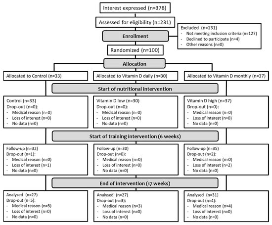 Considering these issues, we hypothesized that any beneficial effects of RT would be increased when 25(OH)D status is elevated by supplementation of vitamin D3. Therefore, the aim of the current study was to evaluate whether the effects of a progressive RT on physical performance parameters would be modulated by two different vitamin D supplementation regimes in community-dwelling older adults with low to moderate baseline vitamin D levels.