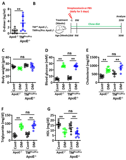 Plasma D-dimer, body weight, blood glucose and plasma lipid levels. (A) Plasma D-dimer levels. (B) Experimental design. Body weight (C), blood glucose levels (D), total plasma cholesterol levels (E), plasma triglyceride levels (F) and plasma HDL levels (G). ApoE-/- and TMPro/Pro ApoE-/- control mice (Cont, normal chow diet, citrate instead of streptozotocin injections), ApoE-/- DM mice and TMPro/Pro ApoE-/- DM (normal chow diet, streptozotocin injections). Each dot represents data obtained from one mouse specimen (n = at least 6 mice per group); ** p < 0.01; ns: non-significant; Mann–Whitney U test (A); two-way ANOVA (C–G).