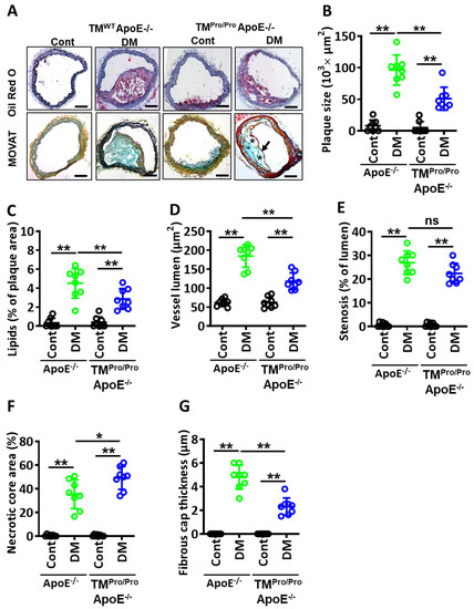 Less stable plaques in hyperglycemic TMPro/Pro ApoE-/- versus hyperglycemic ApoE-/- mice. (A,B) Representative images showing MOVATs staining (A, lower panel) and Oil Red O staining of brachiocephalic arteries (A, upper panel). Dot plot summarizing the plaque area data (B). Necrotic core area within plaque is indicated by a * and fibrous caps thickness by a black arrow. (C) Dot-plot summarizing lipid deposition within brachiocephalic arteries, Oil Red O-staining. (D,E) Dot plot summarizing the total vessel lumen area (D) and extent of stenosis (E) derived from morphometric analyses of MOVAT-stained images of brachiocephalic arteries. (F,G) Morphometric analyses of MOVATs stained images of brachiocephalic arteries reveal increased necrotic core area (F) and thinner fibrous caps (G), in TMPro/Pro ApoE-/- DM mice compared to ApoE-/- DM. The dot plots in b-f summarize the results obtained from MOVAT-stained brachiocephalic arteries. ApoE-/- and TMPro/Pro ApoE-/- control mice (Cont, normal chow diet, citrate instead of streptozotocin injections), ApoE-/- DM mice and TMPro/Pro ApoE-/- DM (normal chow diet, streptozotocin injections). Each dot represents data obtained from one mouse specimen (n = 8, each group); ** p < 0.01, * p < 0.05; ns: non-significant; two-way ANOVA.