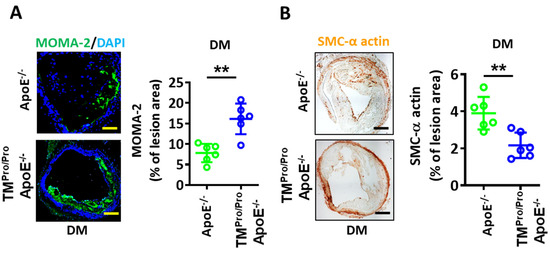 In plaques of TMPro/Pro ApoE-/- DM mice, the macrophage area (immunohistochemically positive for MOMA-2) was increased (Figure 4A), while the area staining positive for smooth muscle cells (SMC α-actin positive area) was reduced in comparison to plaques of ApoE-/- DM mice (Figure 4B). The observed shift to more macrophages and fewer SMCs corroborates the reduced plaque stability in TMPro/Pro ApoE-/- DM mice.