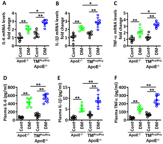 More proinflammatory cytokines in hyperglycemic TMPro/Pro ApoE-/- versus hyperglycemic ApoE-/- mice. (A–C): Dot plot summarizing data for real-time PCR showing aortic expression of IL-6 (C), IL-1β (D) and TNF-α (E). GAPDH was used as a housekeeping gene. (D–F): Dot plot summarizing data for plasma levels of IL-6 (D), IL-1β (E) and TNF-α (F). ApoE-/- and TMPro/Pro ApoE-/- control mice (Cont, normal chow diet, citrate instead of streptozotocin injections), ApoE-/- DM mice and TMPro/Pro ApoE-/- DM (normal chow diet, streptozotocin injections). Each dot represents data obtained from one mouse specimen (n = at least 6 mice per group); ** p < 0.01, * p < 0.05; ns: non-significant; two-way ANOVA.