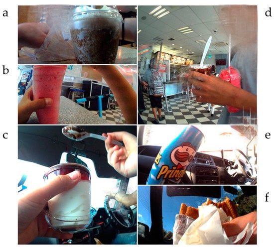 Consumption (n = 20) of fast-food was higher than its purchase (n = 17) (Table 5). Children were occasionally given fast-food while seated in a car, perhaps if an adult had purchased food at a drive-through. In these cases, the purchase occasion was not seen in images if a child was sitting in a back seat. Figure 2 presents images of food consumption.