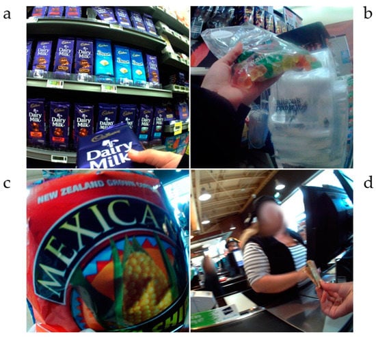 Food purchases in a supermarket. (a) chocolate; (b) confectionary from self-service pick and mix; (c) corn chips; (d) image of participant purchasing food at checkout.