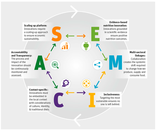 A food system innovation for healthy diets is defined as a policy or regulation, an institutional process, a change in knowledge, a technology, or combination thereof that is either not used or not widely used within a food system but has the potential to change diets on a wider scale [20]. The SEMICA principles seek to guide food system actors in designing an evidence-based and sustainable FSI for healthier diets. The identification of the principles serves as a starting point for an agreed definition among the food system community and can complement the above definition by providing a practical approach and solution to FSI to address the various challenges of our food system. We, therefore, propose an updated definition for this concept and define an FSI for healthier diets as an intervention that meets the SEMICA principles.