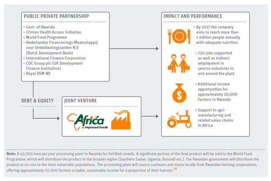Innovations can be scaled through private sector approaches or through self-generated revenues and market-based investments. Other scaling-up platforms include the public sector through support from government, not-for-profit approaches supported by philanthropy, or hybrid approaches such as PPPs. Initial soft funding, also known as patient capital, is needed to tolerate unpredictable returns, the risks, and uncertainty involved in scaling a novel product or technology or model. There are some successful examples in the form of microfinance institutions that provide livelihood loans to smallholder farmers or grassroots food enterprises. Other examples include philanthropic or international organizations’ funding toward subsidy such as vouchers for purchasing nutritious products or government subsidy for solar technology toward food storage and machinery to increase adoption of renewable energy. Such flexible funding can dismantle barriers to scale by minimizing the high start-up costs, developing capabilities or building infrastructure that can support many enterprises at the same time. Additionally, the government and regulators have an important role to play in reforming specific policies and regulatory restrictions that make it difficult for innovations to compete with incumbents. For example, taxing unhealthy foods paves the way for more innovative foods to enter the market. Public sector actors also have a unique role in creating commonly used infrastructure. It could be in the form of physical infrastructure, such as the construction of food warehousing, cold storage, and logistics networks, or social infrastructure, such as the formation of self-help groups and cooperatives, thereby empowering them to run viable enterprises. Leveraging individual strengths is at the core of PPPs, which have a potential for an extensive transformation. In Rwanda, Africa, Improved Foods is one such example that mobilized private capital, technology, and know-how to build local production facilities. It also supports thousands of smallholder farmers while the government and the World Food Programme pooled demand and activated the distribution of nutritious foods to reach the most vulnerable groups [44] (Figure 2).