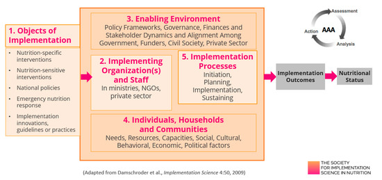 - Tumilowicz, A.; Ruel, M.T.; Pelto, G.; Pelletier, D.; Monterrosa, E.C.; Lapping, K.; Kraemer, K.; De Regil, L.M.; Bergeron, G.; Arabi, M.; et al. Implementation Science in Nutrition: Concepts and Frameworks for an Emerging Field of Science and Practice. Curr. Dev. Nutr. 2019, 3, nzy080. [Google Scholar] [CrossRef] [Green Version]