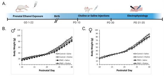 Choline treatment did not significantly affect body weight. (A). Cartoon outlining the experimental timeline for PNEE, choline administration, and electrophysiology. The average body weights (g) across the experimental timeline are shown for both (B) male offspring (n = 10–12 animals per group) and (C) female offspring (n = 6–14 animals per group).
