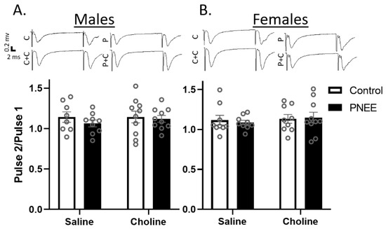No changes in PPR with PNEE or choline treatment. The average paired pulse ratios (slope of pulse 2/pulse 1) are presented as bar graphs with individual data points as small circles for (A) male and (B) female offspring in all conditions. (C) Control + saline; (C + C) control + choline; (P) PNEE + saline; and (P + C) PNEE + choline. Representative paired pulse fEPSP traces are shown above each graph. Error bars are ±SEM.