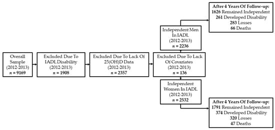 Nevertheless, in addition to presenting discrepant results, none of these studies investigates the association between vitamin D status and the risk of incidence of IADL disability and how it occurs in men and women. Therefore, our objective was to investigate whether there is an association between deficient serum 25(OH)D and the risk of incidence of disability in IADL separately in English men and women.