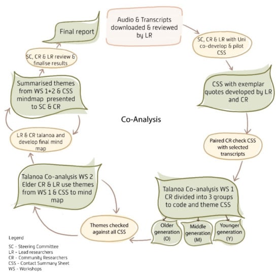 Data collection occurred over a three-month period from September to November 2020 and interviews were conducted face-to-face or via the online video communication platform Zoom (©2021 Zoom Video Communications, Inc., San Jose, CA, USA), based on participant preference. Talanoa sessions took between 90 to 120 min. All interviews were audio-recorded and transcribed using Otter ai 2.0 Software (Otter.ai. Software Development, Mountain View, CA, USA). Each CR team uploaded the recording onto a secured shared drive, accessible only to the university researchers. Participants were given the opportunity to read a copy of their transcript and make changes. Each interview transcript was reviewed by the lead researchers for verbatim accuracy against the recording, making sure that any words in the language were captured correctly. Words that were incorrectly transcribed were reviewed with the CR and SC and edited accordingly.