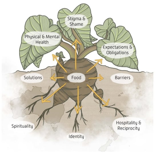 From the talanoa, eight key themes emerged. In keeping with the Māori and Pasifika story-telling tradition, the themes are represented metaphorically and visually in Figure 3. Taro was chosen as it was described as a common staple food among most of those interviewed. Each theme is further discussed below with selected quotes. Quotes are designated by community group/cultural identification and generation (O; M; Y). Solutions and barriers to food insecurity will not be discussed in detail in this paper.