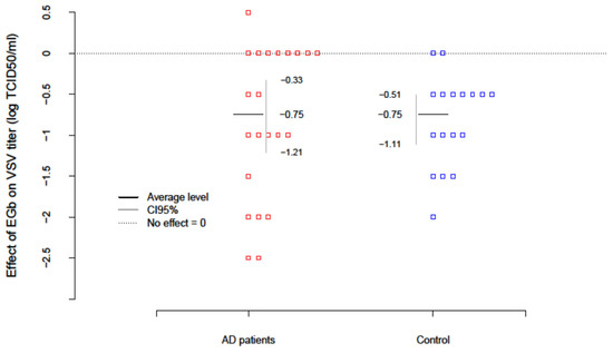 EGb effect on VSV replication (level of innate immunity) in PBLs from AD patients and healthy age-matched controls. EGb effect was measured as difference between VSV titer (log TCID50/mL) after EGb treatment and VSV titer (log TCID50/mL) before EGb treatment. Red and blue squares are individual observations.