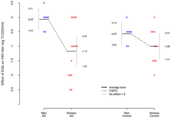 Sex-dependent differences in EGb effect on VSV replication/level of innate immunity in AD patients and healthy age-matched controls. EGb effect was measured as difference between VSV titer (log TCID50/mL) after EGb treatment and VSV titer (log TCID50/mL) before EGb treatment. Red and blue squares are individual observations.