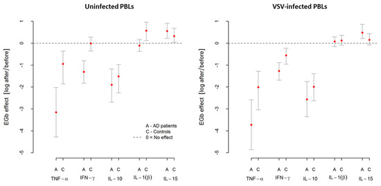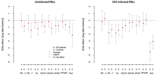 Changes in relative expression of inflammatory-associated genes after EGb treatment in uninfected and VSV-infected PBLs from AD patients and healthy age-matched controls. EGb effect was measured as natural logarithm of ratio after/before gene expression. Zero means no effect. Points represent average change after treatment with confidence interval CI95% for the average.