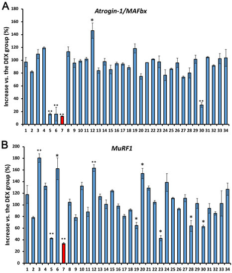 Effect of extracts of 34 spices and herbs on the mRNA expressions of (A) atrogin-1/MAFbx and (B) MuRF1 in L6 myotubes. When L6 cells reached 90% confluence, the Dulbecco’s modified Eagle’s medium (DMEM) was replaced with 2% fetal bovine serum (differentiation medium), and the cells were further incubated for 9 days. L6 myotubes were then preincubated for 12 h with different concentrations of spices and herbs. Thereafter, dexamethasone (DEX; 10 nM) was added and myotubes were incubated for 12 h. The red columns represent the laurel treatment group. Data are shown as the mean ± standard error (SE) (n = 4). Statistical significance was determined by Dunnett’s test. * p < 0.05, ** p < 0.01 vs. DEX group.