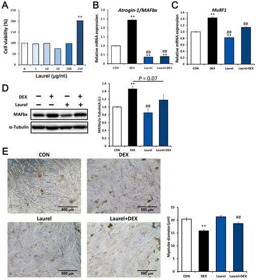 The potential cytotoxicity of laurel toward C2C12 cells was determined by the LDH assay. As shown in Figure 2A, C2C12 cells were incubated with laurel for 12 h, and the cell viability was not significantly affected by the concentrations tested (5–100 μg/mL). We next investigated the changes in the levels of muscle-specific ubiquitin ligases to elucidate the effects of laurel on C2C12 cells. As depicted in Figure 2B,C, DEX significantly upregulated mRNA expression of atrogin-1/MAFbx and MuRF1 compared with that in unstimulated cells, which indicates that DEX administration enhanced the expression of these genes that are involved in proteolysis, and laurel markedly decreased their expression (by 79.5% for atrogin-1/MAFbx and16.3% for MuRF1). Notably, treatment with laurel alone reduced the expression of atrogin-1/MAFbx and MuRF1 to 36.8% and 82.0%, respectively, compared with that in the control group, reflecting its ability to reduce both the basal and DEX-induced expression of atrogin-1/MAFbx and MuRF1. Furthermore, Western blot analysis revealed that atrogin-1/MAFbx levels were significantly upregulated in DEX-treated C2C12 cells, and laurel treatment downregulated the protein levels both in the presence and absence of DEX (Figure 2D).