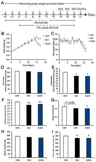 In total, 21 rats were randomly divided into three groups (n = 7/group) as follows: (1) control group (normal diet, 40% w/v aqueous ethanol, 60% PBS, intraperitoneal (i.p.) injections in the last 3 days); (2) DEX group (normal diet); (3) 2LDEX group, administered 2% laurel powder in feed throughout the experimental period (17 days), both before and after DEX injection. Animals in the DEX and 2LDEX groups were injected with DEX (300 μg/kg body weight/day, 40% w/v aqueous ethanol, 60% PBS, i.p.) three times at intervals of 24 h starting at day 14 to induce experimental skeletal muscle atrophy. The rats were anesthetized with isoflurane at the end of the experiment (day 17). Body weights and food intake were measured, and the lower limb skeletal muscles (tibialis anterior, gastrocnemius, soleus, and extensor digitorum longus) were removed, weighed, and flash-frozen for mRNA and protein analyses.
