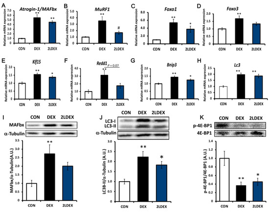 The key regulatory checkpoints of ubiquitin-proteasome and autophagolysosome systems are markers of muscle atrophy. We thus explored the molecular mechanisms through which laurel inhibits skeletal muscle atrophy by detecting the expression changes of autophagy-related genes (Bnip3 and Lc3), an mTORC1 activity suppressor (Redd1), and transcription factors (Klf15, Foxo1, and Foxo3) in the tibialis anterior and gastrocnemius tissues. As illustrated in Figure 4C, in the tibialis anterior muscle, the mRNA expression of Foxo1 in the DEX group was significantly higher than that in the control group and tended to decrease in the 2LDEX group to 67.6% of the level in the DEX group (p = 0.10). No significant differences in the mRNA expression of Foxo3, Klf15, Redd1, Bnip3, and Lc3 were found between the DEX-treated groups (Figure 4D–H).