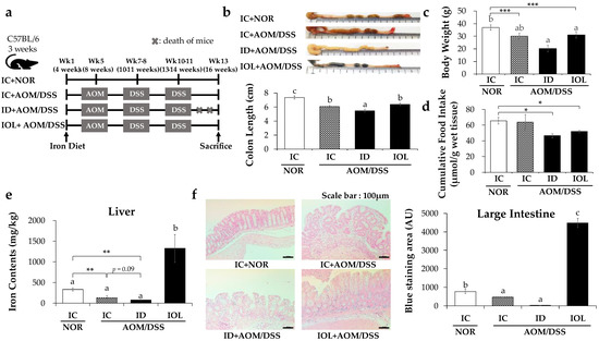 Amount of dietary iron changes inflammation and iron status in the large intestine. Experimental timeline (a), and colon length data (b) and body weight at final week (c), cumulative food intake (d) of each group (IC + NOR, IC + AOM/DSS, ID + AOM/DSS, IOL + AOM/DSS). ICP-OES & ICP-MS data measuring the amount of iron in the liver (e) and Perls’ Prussian blue staining of the large intestine of mice and the intensity of staining visible within a tissue section (f) are presented. Data are expressed as Mean ± SD. One-way ANOVA was used for the test of difference and Tukey for the post-hoc test. Different letters above the value indicate statistical significance. Student’s t-test was used to test the difference between two groups, and the asterisk represents statistical significance (* p < 0.05; ** p < 0.01, *** p < 0.001). Scale bar = 100 μm. Abbreviations: NOR, normal; AOM/DSS, azoxymethane/dextran sodium sulfate; IC, iron control; ID, iron-deficient; IOL, iron overload; AU, arbitrary units.