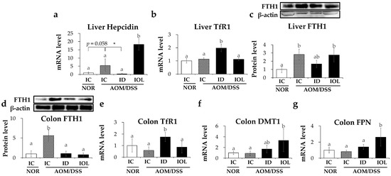 As we confirmed that the iron content in the liver and colon tissues was affected by AOM/DSS treatment or IOL diet, we examined the changes in the expression of iron metabolism genes and regulatory mechanisms in the AOM/DSS mouse model. The liver maintains systemic iron homeostasis and responds to excess iron by increasing hepcidin expression and storing excess iron in the liver using FTH1 [45]. The expression of liver hepcidin, a systemic regulator of iron metabolism [46], increased significantly in the IOL + AOM/DSS group compared to that in the other groups and decreased in the ID + AOM/DSS group compared to that in the IC + AOM/DSS group (Figure 2a). The expression of TfR1, an iron importer, increased only in the ID + AOM/DSS group liver compared with the others [47] (Figure 2b). Similar to those in the liver, mRNA and protein levels of TfR1 in the large intestine were significantly increased only by the ID diet among the AOM/DSS-treated groups (Figure 2e), suggesting that iron import may be induced to improve the low-iron status in both the liver and the large intestine (Figure 2b,e). The protein level of FTH1 in the liver was higher in the IC + AOM/DSS group than in the IC + NOR group and did not change among the AOM/DSS groups, although the ID + AOM/DSS group showed a marginal reduction without statistical significance (Figure 2c). The protein level of FTH1 in the colon was higher in the IC + AOM/DSS group than in the other groups, whereas, unlike those in the liver, FTH1 levels were significantly reduced in the ID + AOM/DSS and IOL + AOM/DSS groups (Figure 2d). The mRNA levels of DMT1 and FPN did not differ between the IC + NOR and IC + AOM/DSS groups, but were significantly upregulated in the IOL + AOM/DSS group compared with those in the other groups (Figure 2f,g). Overall, the data suggest that AOM/DSS caused the upregulation of FTH1, which was significant in the large intestine, but not in the liver, by either ID or IOL diets. However, colonic FTH1 protein levels were reduced by the ID and IOL diets. IOL diets induced the unexpected upregulation of DMT1 in AOM/DSS, but other iron regulatory genes, including hepcidin, TfR1, and FPN, were regulated by iron diets, as expected.