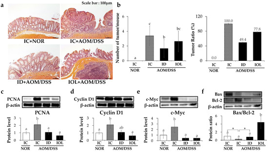 In addition, protein levels of proliferating cell nuclear antigen (PCNA), cyclin D1, and c-Myc were significantly higher in the IC + AOM/DSS group than in the IC + NOR group (Figure 3c–e). However, protein levels of PCNA and c-Myc were considerably lower in the ID + AOM/DSS and IOL + AOM/DSS groups than in the IC + AOM/DSS (Figure 3c–e). Only IOL + AOM/DSS exhibited a significant reduction in cyclin D1 expression (Figure 3d). As for Bcl-2-associated X protein (Bax)/B-cell lymphoma (Bcl)-2 ratio, which has been suggested to determine the susceptibility to apoptosis [49], there were statistical differences when comparing IC + NOR with IC + AOM/DSS and ID + AOM/DSS groups, while IOL + AOM/DSS showed a significantly higher ratio than those of all other groups (Figure 3f). The data suggest that both ID and IOL diets prior to AOM/DSS-induced colorectal cancer formation might alleviate the incidence of colorectal cancer by decreasing cellular proliferation by both diets and increasing apoptosis only by IOL.