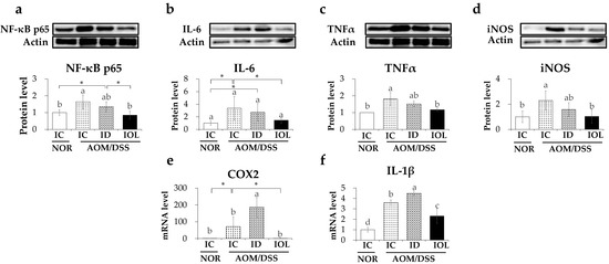 Iron overload downregulated the expression of genes related to AOM/DSS-induced inflammation. Protein expression levels on NF-κB p65 (a), IL-6 (b), TNFα (c), iNOS (d), and mRNA expression level of COX2 (e), IL1b (f) related to inflammation released from large intestine tissue were measured. Data are expressed as Mean ± SD and SE. One-way ANOVA was used for the test of difference and Tukey for the post-hoc test. Different letters above the value indicate statistical significance. Student’s t-test was used to test the difference between two groups and the asterisk represents statistical significance (* p < 0.05). Abbreviations: NOR, normal; AOM/DSS, azoxymethane/dextran sodium sulfate; IC, iron control; ID, iron-deficient; IOL, iron overload; NF-κB, nuclear factor kappa-light-chain-enhancer of activated B cells; IL-6, interleukin 6; TNFα, tumor necrosis factor alpha; iNOS, inducible nitric oxide synthase; COX2, cyclooxygenase-2; IL-1β, interleukin 1 beta.