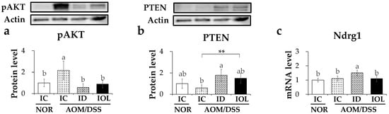 To explore other possible mechanisms by which dietary ID or IOL affects tumor volume reduction, we specifically assessed PI3K/AKT pathway genes that interfere with cell proliferation and survival in various cancers, including CRC [57]. First, the level of phosphorylated AKT (pAKT), an activated form of AKT, was higher in IC + AOM/DSS than in IC + NOR, whereas other AOM/DSS-treated groups showed no statistically significant differences (Figure 6a). Phosphatase and tensin homolog (PTEN), a negative regulator of the PI3K/AKT pathway [57], were upregulated significantly in ID + AOM/DSS mice and marginally in IOL + AOM/DSS mice, compared with those in IC + AOM/DSS mice (Figure 6b). In addition, the mRNA levels of N-Myc downstream regulated 1 (Ndrg1), a tumor metastasis suppressor [58], were elevated in the ID + AOM/DSS group, but not in the IOL + AOM/DSS group, compared with those in the IC + AOM/DSS group (Figure 6c). These data might suggest that both dietary ID and IOL hindered the proliferation of AOM/DSS-generated tumors by suppressing the PI3K/AKT pathway. ID diet induced this in part through an increased expression of Ndrg1, which was not observed in IOL diet-fed mice.