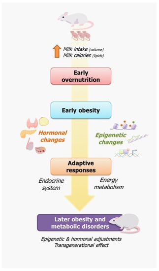 Early overnutrition triggers adaptive responses of the endocrine system and energy metabolism leading to the obesity phenotype of the small litter model. Early overnutrition is a result of increased volume and calorie intake during the lactation period, resulting in early obesity. In response to this early metabolic overload, adaptive responses arise, involving the endocrine system and energy metabolism, which contribute to obesity and metabolic disorders in adult life in offspring raised in small litters.