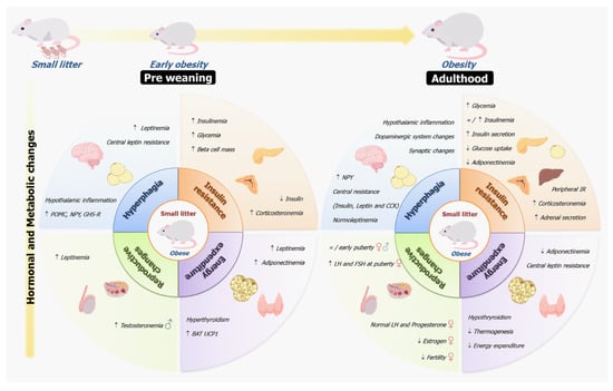 The rodent litter size reduction model is an efficient experimental tool for investigating the impact of early postnatal overnutrition on the development of metabolic diseases. There are early and later adaptive hormonal and metabolic changes described in the literature, which are involved in hyperphagia, energy expenditure changes, insulin resistance, and reproductive changes, featuring the obese phenotype of the small litter model (Figure 3). In programming models, it is difficult to establish a causal relationship of the changes exhibited by the offspring, since several adaptive alterations occurs in different systems at different periods. The overnutrition promoted by increased milk volume and lipid intake can directly affect cell and tissue function, such as that of the pancreas, or indirectly, by hormonal alterations. The early hyperletinemia and hyperinsulinemia in response to overnutrition seem to affect central and peripheral systems, contributing to hyperphagia, changes in the energy expenditure and insulin resistance. The hyperphagia can be due to hypothalamic inflammation and changes in regulatory mechanisms of satiety and energy expenditure, such as the brain–gut axis. Therefore, several complex alterations are involved in the obese phenotype of SL model. These findings demonstrate the importance of the lactation period as a time window susceptible to metabolic disorders and suggest the potential mechanisms involved in the early obesity phenotype and its persistence until adult life. In this review, we described the changes in energy metabolism and its contribution to the obesity phenotype, highlighting the adjustments of the central and endocrine systems as an adaptive mechanism.
