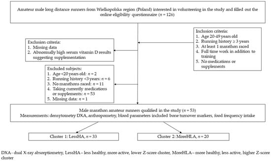 Healthy male amateur runners from Poland, Wielkopolska region (n = 53) were recruited into the study between October and March 2017–2018 from local social media groups and marathon races (Figure 1). During the one laboratory visit, the participants were measured for body composition and bone mineral density, and blood was drawn. They filled out a questionnaire concerning nutritional habits and food frequency intake. According to the inclusion criteria, all of the participants did not take any medication or high-dose vitamin or mineral supplements, trained long distance running for a minimum of 3 years, had to run at least one marathon, and worked full time. The study was accepted by the local IRB board (Poznan University of Medical Sciences, obtained on 7 September 2017, Resolution No. 895/17).