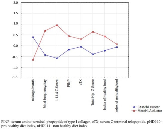 The LessHA cluster is also characterised by high mileage and running history. This supports the fact that intensive long-distance running compromises the bone mineral density among both professional athletes and amateurs []. In turn, 25-OHD3 was not associated with LessHA, which supports previous studies on bone health in professional athletes [].