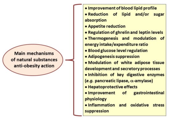 According to data reported by the World Health Organization, the number of obese subjects has nearly tripled since 1975, leading to more than 1.9 billion overweight adults in 2016 []. Obesity has become the largest global chronic health problem in Western civilization, and the available anti-obesity therapies are limited by many side effects, risks associated with surgical interventions and obesity relapse []. For that reason, lifestyle factors such as balanced diet and physical activity remain fundamental both at the stage of obesity prevention and treatment. In addition, many studies suggest that some of the plant-derived substances and herbal medicines can be helpful anti-obesity agents []. Their beneficial properties have been attributed to various mechanisms of action, including appetite reduction, stimulation of thermogenesis, pancreatic lipase inhibitory effects, reduction in dietary fat absorption, stimulation of lipolysis and reduction in lipogenesis (Figure 1) [,].