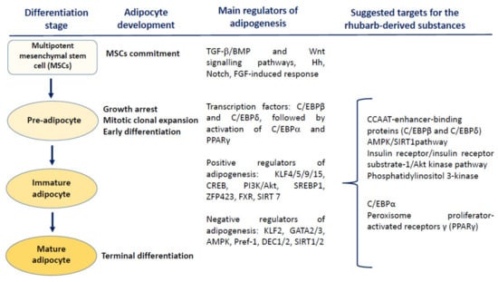 Although the energy storage is commonly believed to be the main role of white adipose tissue, current knowledge of human physiology evidently indicates its important endocrine activity, influence on numerous molecular pathways and modulatory effect on homeostasis []. Studies on anti-obesity actions of various natural substances and herbal remedies are focused on several points that may be critical in the regulation of either adipogenesis or secretory activity of the adipocytes. During this multistep process, phytochemicals (including compounds present in rhubarbs) may interact at the mitotic clonal expansion, early differentiation and terminal differentiation stages of adipogenesis (Figure 3). Due to multifactorial etiology and pathophysiology of obesity, many mechanisms underlying the anti-obesity effects of phytochemicals still remain only partly elucidated. Existing evidence indicates that the main targets for most plant-derived anti-obesity agents are key regulators of adipogenesis such as CCAAT/enhancer-binding proteins (C/EBPs) and the peroxisome proliferator-activated receptors (PPARs), as well as the AMP-activated protein kinase (AMPK), a regulator of energy metabolism [,,]. An additional aspect of the beneficial action of phytochemicals in obese subjects may be their anti-inflammatory properties, including the ability to inhibit the nuclear factor kappa-light-chain-enhancer of activated B cells (NF-κB)-triggered signalling []. Exemplary molecular targets for phytochemicals are the phosphatidylinositol 3-kinase and Akt/Protein Kinase B (PI3K/Akt) pathway, the IκBα kinase/c-Jun N-terminal kinase (IKK/JNK), and Janus kinase/signal transducers and activators of transcription (JAK/STAT)-mediated response [].