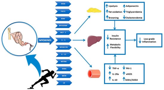Myokines specifically act at the adipose tissue level, by reducing and regulating fat mass expansion, favoring the beige/brown phenotype which, in turn, improves metabolic homeostasis. At a systemic level, myokines improve insulin sensitivity in target tissues and organs (e.g., liver, muscles) [18]. The endocrine adaptation of skeletal muscle in response to exercise training can therefore result in systemic anti-inflammatory effects, counteracting deleterious consequences of metabolic syndrome on the immune system [19].