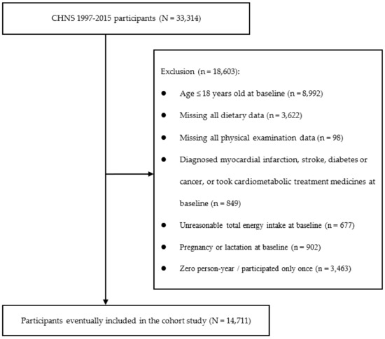 The current prospective cohort study was conducted with the use of the available data from CHNS, wave 1997 to 2015, and the baseline for each participant was defined as the date of their first participation in the dietary survey during this period. In the current investigation, participants below 18 years old (n = 8992) at baseline, with missing values in all dietary (n = 3622) or physical examination records (n = 98), or who were diagnosed with T2DM or other diseases (such as myocardial infarction, stroke, or tumor) that may alter dietary intake and eating behaviors or who were taking medicine known to affect lipid or glucose metabolism at baseline (n = 849) were excluded. In addition, participants with an implausible total energy intake (<800 or >4200 kcal/day for men, <500 or >3500 kcal/day for women, n = 677) at baseline [26], who were pregnant or breast-feeding at baseline (n = 902), or who participated in the survey for only one round (n = 3463) were further excluded. A total of 14,711 participants (7333 men and 7378 women) were included in the final analysis (see Figure 1 for participant flow).