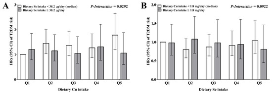 A significant interaction between dietary Cu and Se intake was observed. Dietary Se intake significantly modified the association between dietary Cu intakes and T2DM risk (p-interaction = 0.0292), and dietary Cu intake was positively associated with an increased T2DM risk when the intake of Se was lower than the median intake (Q5 vs. Q1: HR = 1.78, 95% CI: 1.20, 2.65; p = 0.0045) (Figure 2A). No significant effect modification was observed between dietary Se intake and T2DM risk by dietary Cu intakes (p-interaction = 0.0922) (Figure 2B).