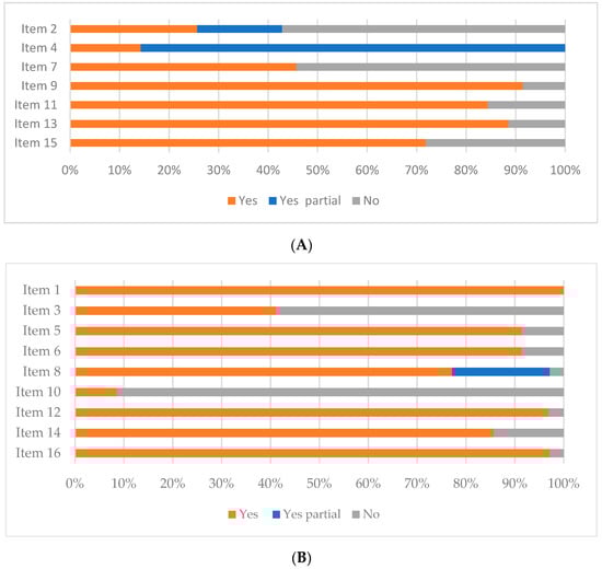 Accomplishment of systematic review with AMSTAR-2 items. (A) Critical items. (B) Non-critical items. Critical items: Item 2: Previous protocol review; Item 4: Adequate literature search; Item 7: Excluded studies justification; Item 9: Bias risk of individual studies included; Item 11: Appropriate meta-analysis methods; Item 13: Consideration of the bias risk in the interpretation of the review results; Item 15: Assessment of the presence and probable impact of publication bias. Non-critical items: Item 1: Research questions and inclusion criteria include PICO components; Item 3: Explaining decision about the study designs to include in the review; Item 5: Study selection performed in duplicate; Item 6: Data extraction performed in duplicate; Item 8: Describing included studies with sufficient detail; Item 10: Reporting the sources of funding for the studies included in the review; Item 12: Assessing the potential impact of bias risk on results; Item 14: Satisfactory explanation and discussing any observed heterogeneity in the review results; and Item 16: Potential sources of conflict including any funding received.