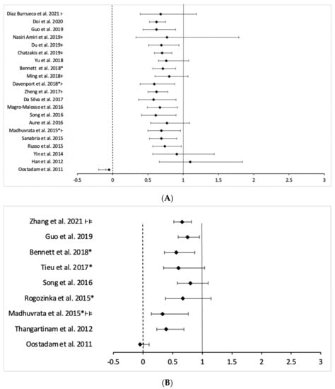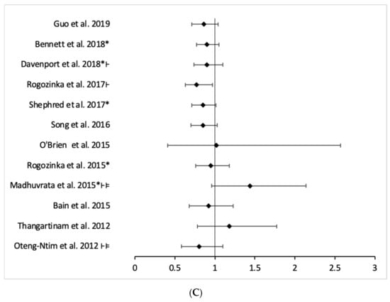 Forest plot of association of lifestyle intervention in reducing the risk of GDM. (A) Physical activity intervention. (B) Diet intervention. (C) Mixed intervention. * Moderate to high-quality review; ⊦: Odds Ratio; and ⊧: Women at high risk.