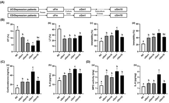 In the previous studies, the fecal microbiota transplantation (FMT) from patients with IBD and depression (IBDD) is reported to cause depression and gut inflammation in mice [,]. Therefore, in the present study, to understand the difference in the occurrence of depression and gut inflammation between IBDD patient fecal microbiota (iFm) and its gut microbiota culture (iGm), we examined their effects on the occurrence of depression and gut inflammation in mice and whether anti-inflammatory probiotics could alleviate gut inflammation and depression in iGm-transplanted mice.
