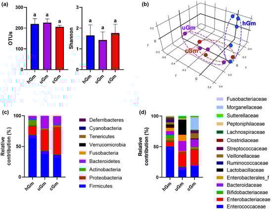 Next, we analyzed the microbiota compositions of iFm and iGm, using Illumina iSeq 100 (Figure 4). The populations of phylum Proteobacteria (Pseudomonadota) and families Enterobacteriaceae and Muribaculaceae more highly detected in the iGm (uGm and cGm) than in the hGm, as in the previous report that the populations of Proteobacteria and Enterobacteriaceae were higher in iFm than in hFm []. However, their populations between the uGm and cGm were not significantly different.