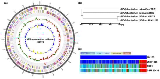 NK175 was 2,263,214 base pairs with a GC content of 62.9% (Figure 7). The total CDS number was 1052.8. The rRNA and tRNA gene numbers were 9 and 61, respectively. Its genome showed the phylogenetic similarity to Bifidobacterium bifidum JCM1255 (98.9%) and Bifidobacterium pullorum DSM20433 (79.5%) and was significantly different from those of previously reported NK151 and NK173 []. Moreover, they did not show hemolytic activity in the blood agar plate. Therefore, NK175 was identified as Bifidobacterium bifidum, based on Gram staining, the API50 CHL kit, and whole genome analyses.