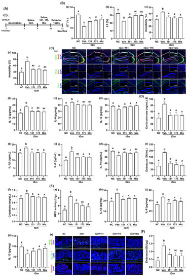 Effects of NK151 and NK175 on iGm-induced depression and colitis in mice. (A) Experimental protocol. (B) Effects on depressive-like behaviors in the EMPT (a), LDTT (b), TST (c), and FST (d). (C) Effects on hippocampal BDNF+NeuN+, NF-κB+Iba1+, claudin-5+ cell populations (a), IL-1β (b), IL-6 (c), and IL-10 values (d). (D) Effects on blood corticosterone (a), IL-1β (b), IL-6 (c), IL-10 (d), endotoxin (e), and creatinine levels (f). (E) Effects on colonic myeloperoxidase (MPO) activity (a), IL-1β (b), IL-6 (c), and IL-10 expression (d), and NF-κB+CD11c+, cladudin-1+, and occludin+ cell populations (e). (F) Effects on fecal endotoxin level. Normal control (NC) was treated with saline instead of test agents and iGm. Test agents (veh, vehicle alone; 151, 1 × 109 CFU/mouse of NK151; 173, 1 × 109 CFU/mouse of NK173; 175, 1 × 109 CFU/mouse of NK175) were orally given in iGm-treated mice daily for 5 days. Groups with same letters are not significantly different (n = 8, p < 0.05).