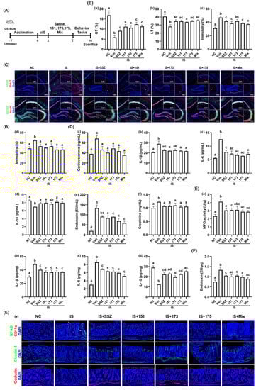 Effects of NK151, NK173, and NK175 on IS-induced depression and colitis in mice. (A) Experimental protocol. (B) Effects on depressive-like behaviors in the EMPT (a), LDTT (b), TST (c), and FST (d). (C) Effects on hippocampal BDNF+NeuN+ and NF-κB+Iba1+ cell numbers. (D) Effects on blood corticosterone (a), IL-1β (b), IL-6 (c), IL-10 (d), endotoxin (e), and creatinine levels (f). (E) Effects on colonic myeloperoxidase (MPO) activity (a), IL-1β (b), IL-6 (c), and IL-10 expression (d), and NF-κB+CD11c+, cladudin-1+, and occludin+ cell numbers (e). (F) Effects on fecal endotoxin level. Normal control mice (NC) were treated with saline instead of test agents and cGm. Test agents (veh, vehicle alone; 151, 1 × 109 CFU/mouse of NK151; 173, 1 × 109 CFU/mouse/day of NK173; 175, 1 × 109 CFU/mouse of NK175) were orally gavaged. Groups with same letters are not significantly different (n = 8, p < 0.05).