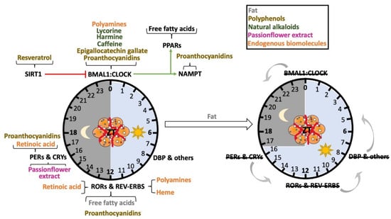 | Polyphenols | Resveratrol | Increases SIRT1activity, modulates circadian rhythms of locomotor activity and body temperature, and reverse adipose tissue-specific circadian gene expression changes induced by a high fat diet | [57,58,59] |