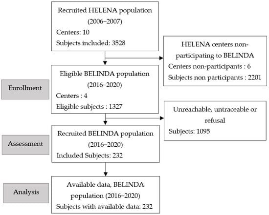 Figure 1 presents the flow diagram of the study. Among the 10 centers and the 3528 subjects included in the context of the HELENA study, four centers agreed to participate in the recruitment for the BELINDA study. A total of 1327 subjects were eligible. Among these 1327 subjects, 1095 were unreachable, untraceable, refused, or were unable to participate because of the COVID-19 pandemic. The final database contains a total of 232 subjects (participation rate = 18%), assessed in the HELENA study and reassessed 10–14 years later in the context of BELINDA, versus 1095 adolescents who did not participate in BELINDA. Table 5 presents the details of the inclusions by investigation center. The six other centers were not able to conduct the study for different reasons (logistics, human resources). Recruitment was interrupted just before the outbreak of the COVID-19 pandemic (February 2020).