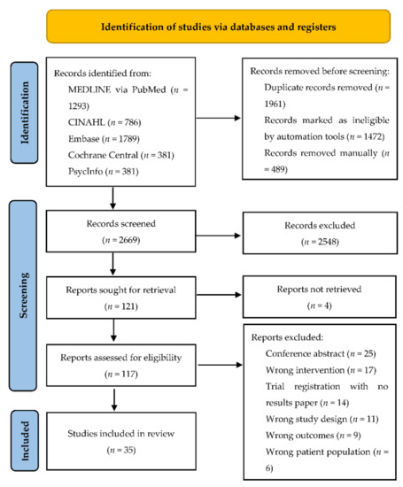 The literature search identified 2669 references after the removal of duplicates, and 2548 were removed after title and abstract screening. Of 121 references retrieved for full text screening, 86 were excluded. The remaining 35 studies were included in this review (Figure 1). Eighteen of these studies were related to a U.S. national program, MOVE! (Managing Overweight/Obesity for Veterans Everywhere), which is an ongoing clinical weight management program for veterans and these are discussed separately.